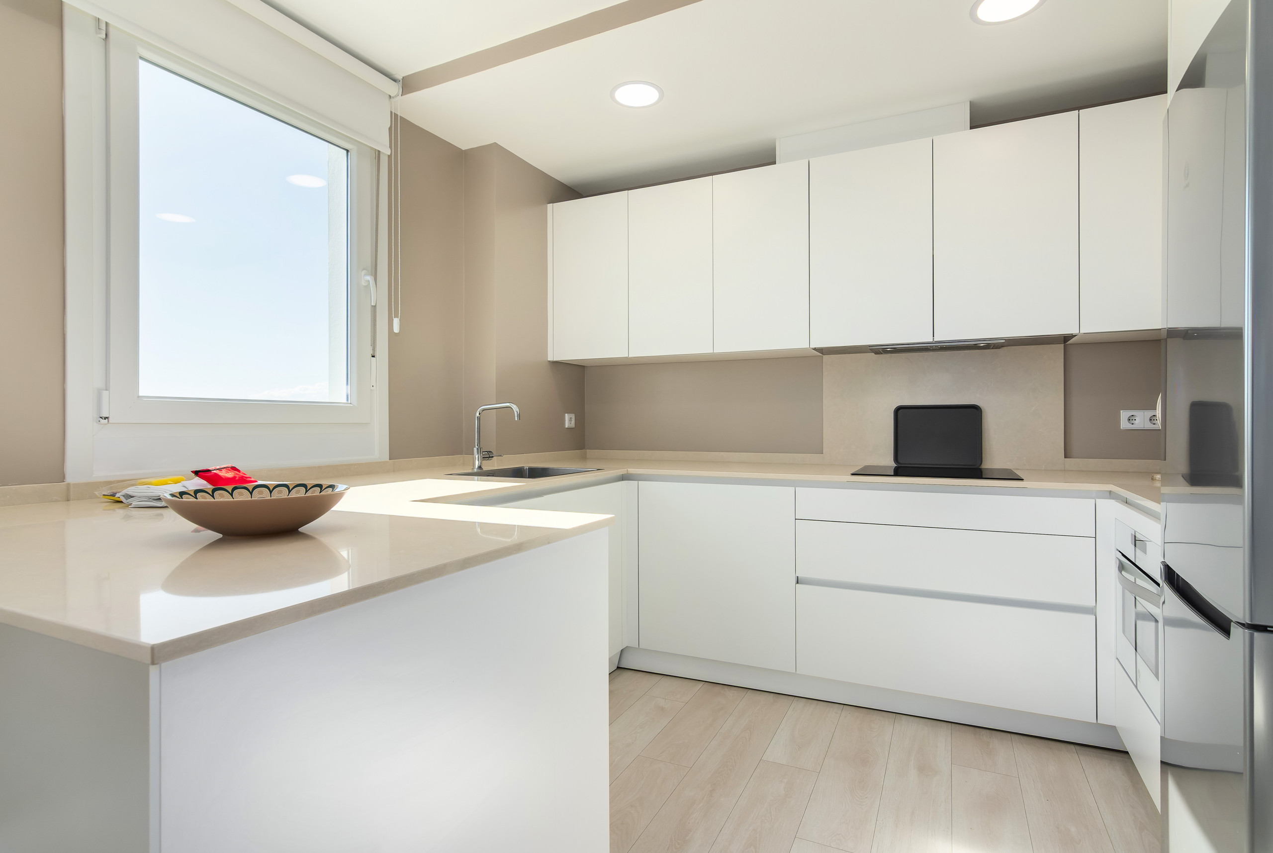 La cocina americana, de inducción, está equipada con nevera, microondas, horno, congelador, lavavajillas, vajilla/cubertería, utensilios/cocina, cafetera y tostadora.