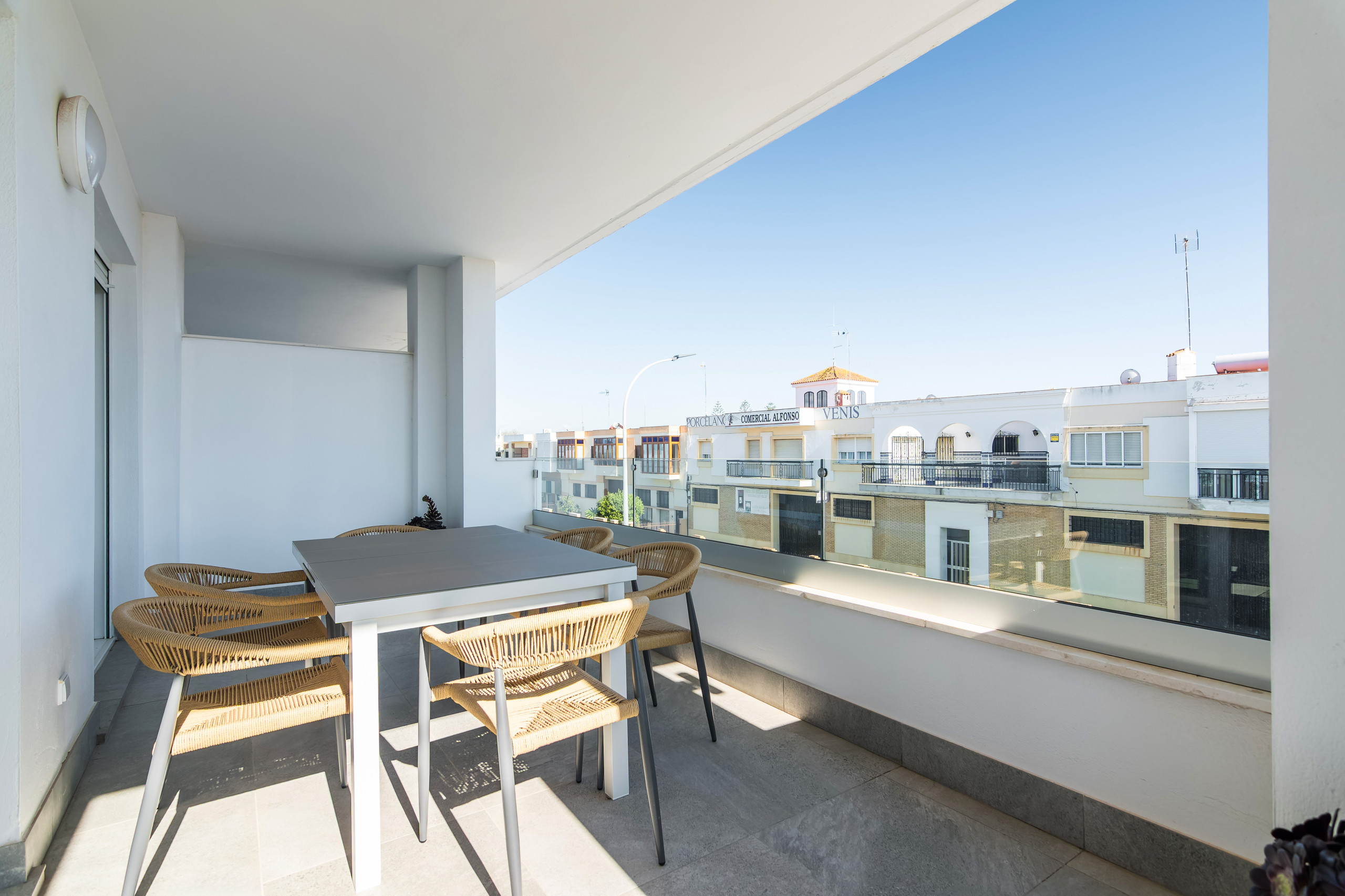 Dispone de jardín, mobiliario jardín, parcela vallada, 71 m² de terraza, lavadora, barbacoa, acceso internet (wifi), zona infantil, pista de tenis, pista de padel, gimnasio, calefacción bomba de calor, aire acondicionado, piscina comunitaria+infantil, parking aire libre en mismo edificio, 3 Televisores.
