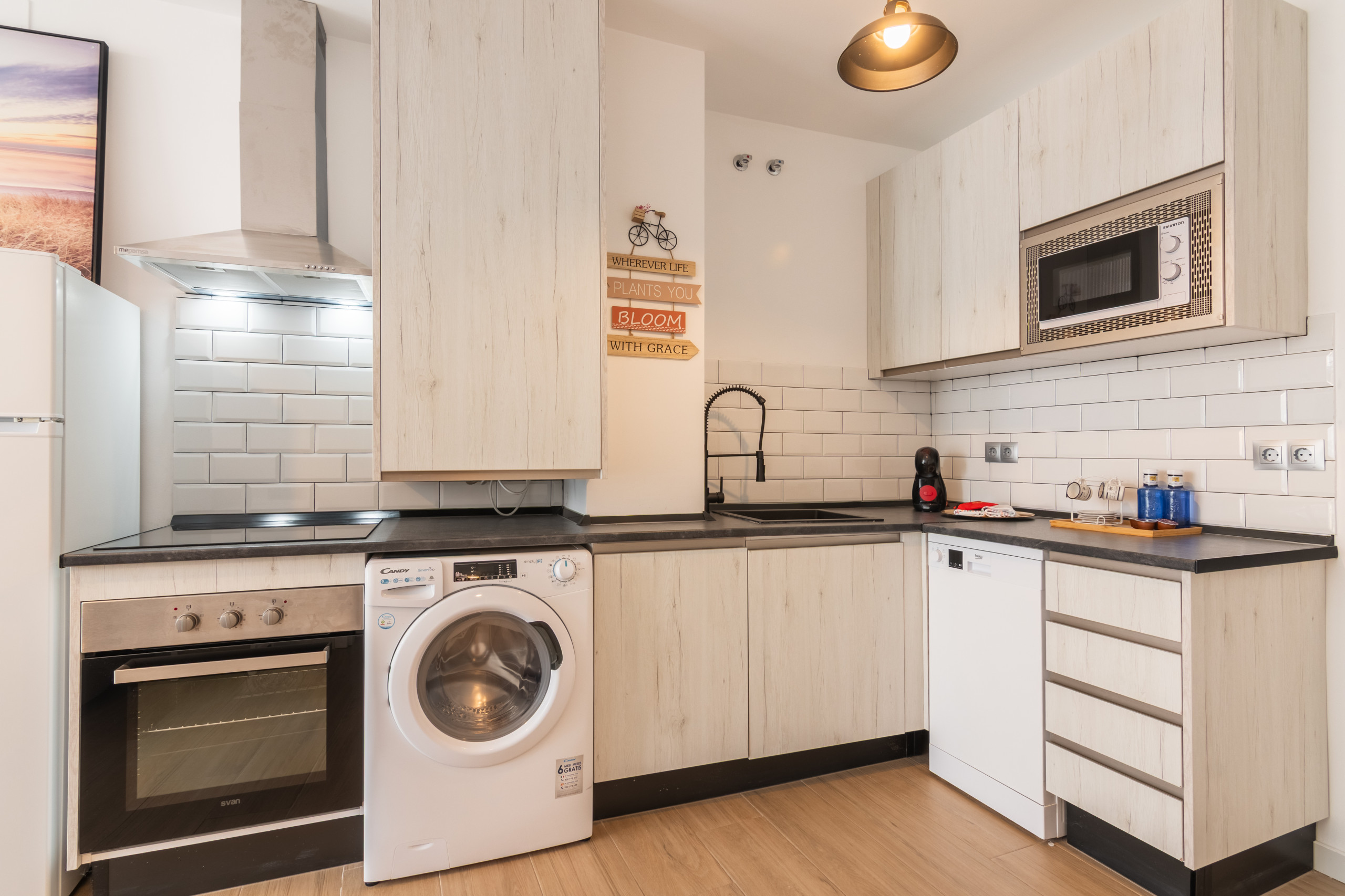La cocina americana, de inducción, está equipada con nevera, microondas, congelador, lavadora, vajilla/cubertería, utensilios/cocina, cafetera, tostadora, hervidor de agua y exprimidor.4 comentarios -