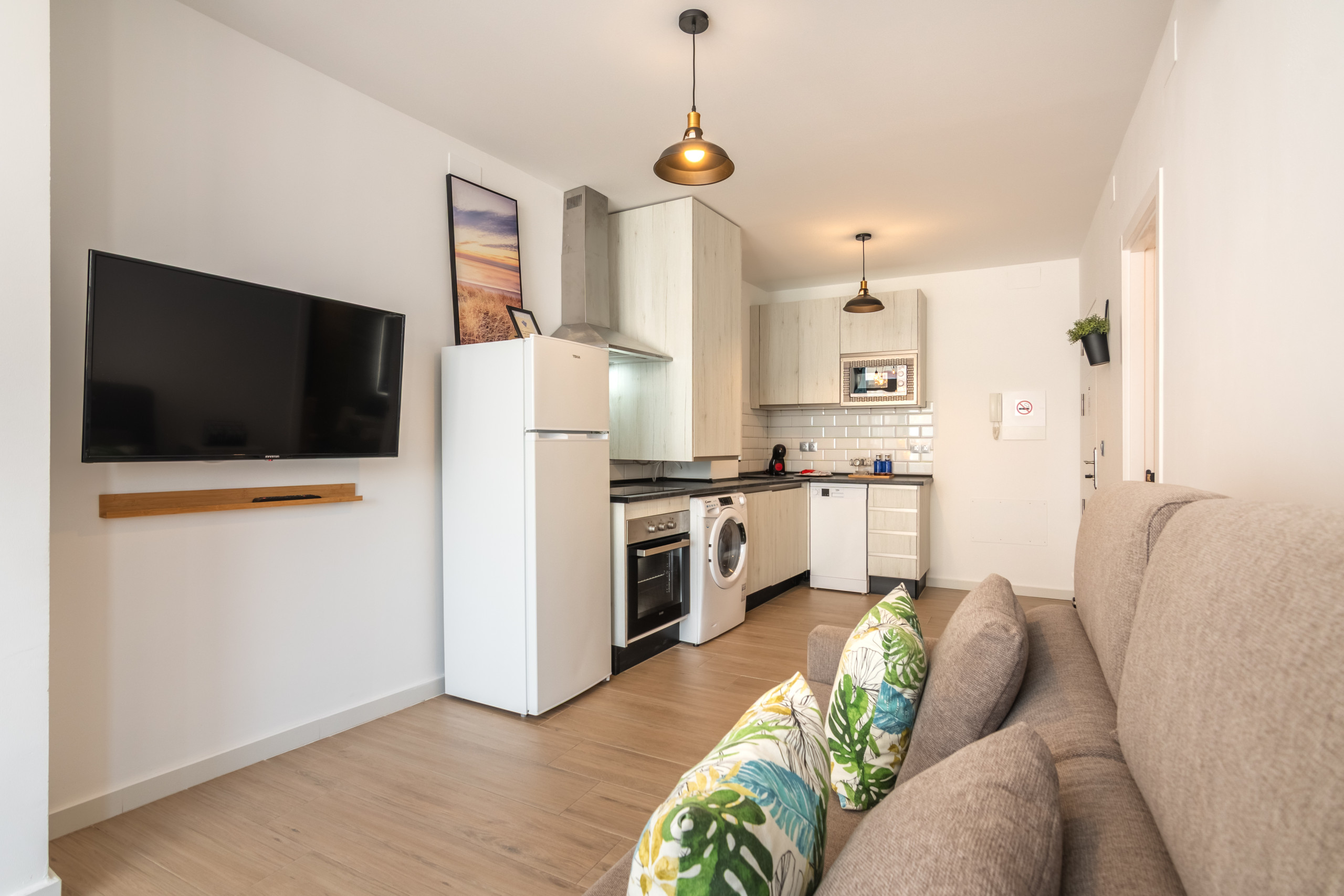 El apartamento cuenta con todo tipo de detalles, dispone de televisor plano en el salón, tiene vitrocerámica en la cocina y está equipada con nevera, microondas, congelador, lavadora, vajilla, cubertería, utensilios de cocina, cafetera, tostadora y hervidor de agua. Por ocio o trabajo, podrá disfrutar de acceso internet (wifi) y para una estancia más confortable tiene calefacción bomba de calor, aire acondicionado en todo el alojamiento,