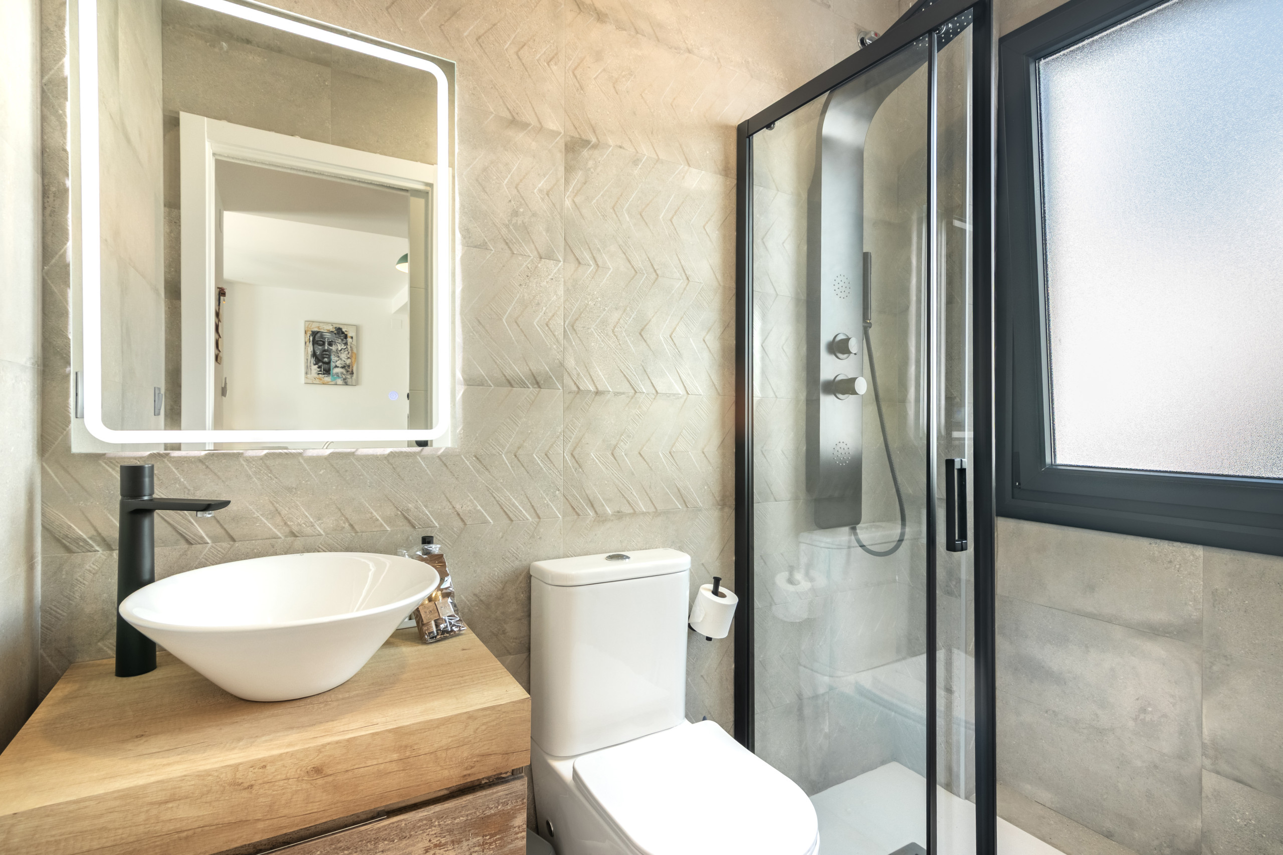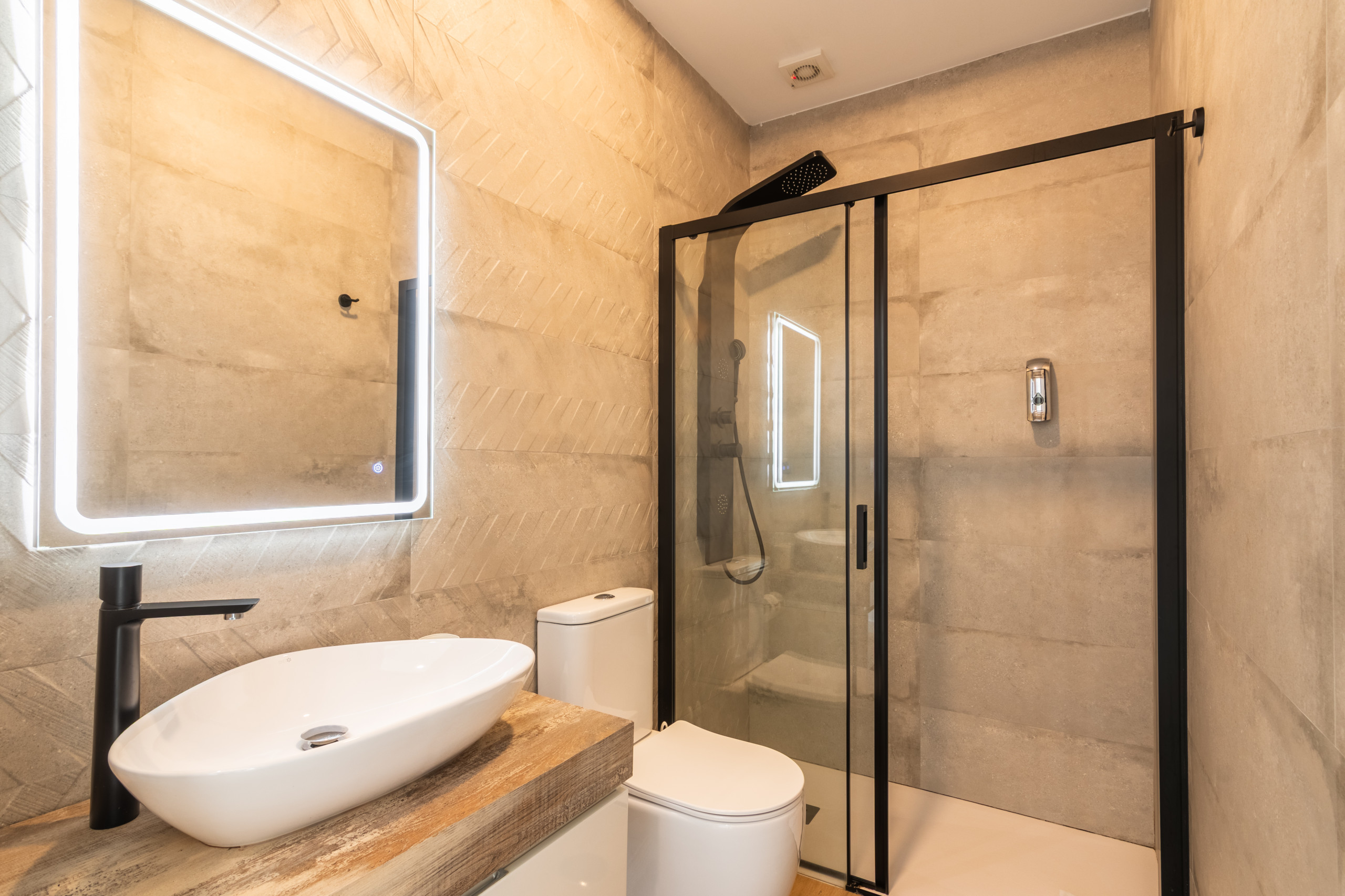 La vivienda cuenta con un luminoso baño con plato de ducha. Su espejo es moderno y táctil de led, que da a la vivienda un toque sofisticado y moderno. Cuenta con secador de mano instalado y sus acabados son de muy buena calidad.
