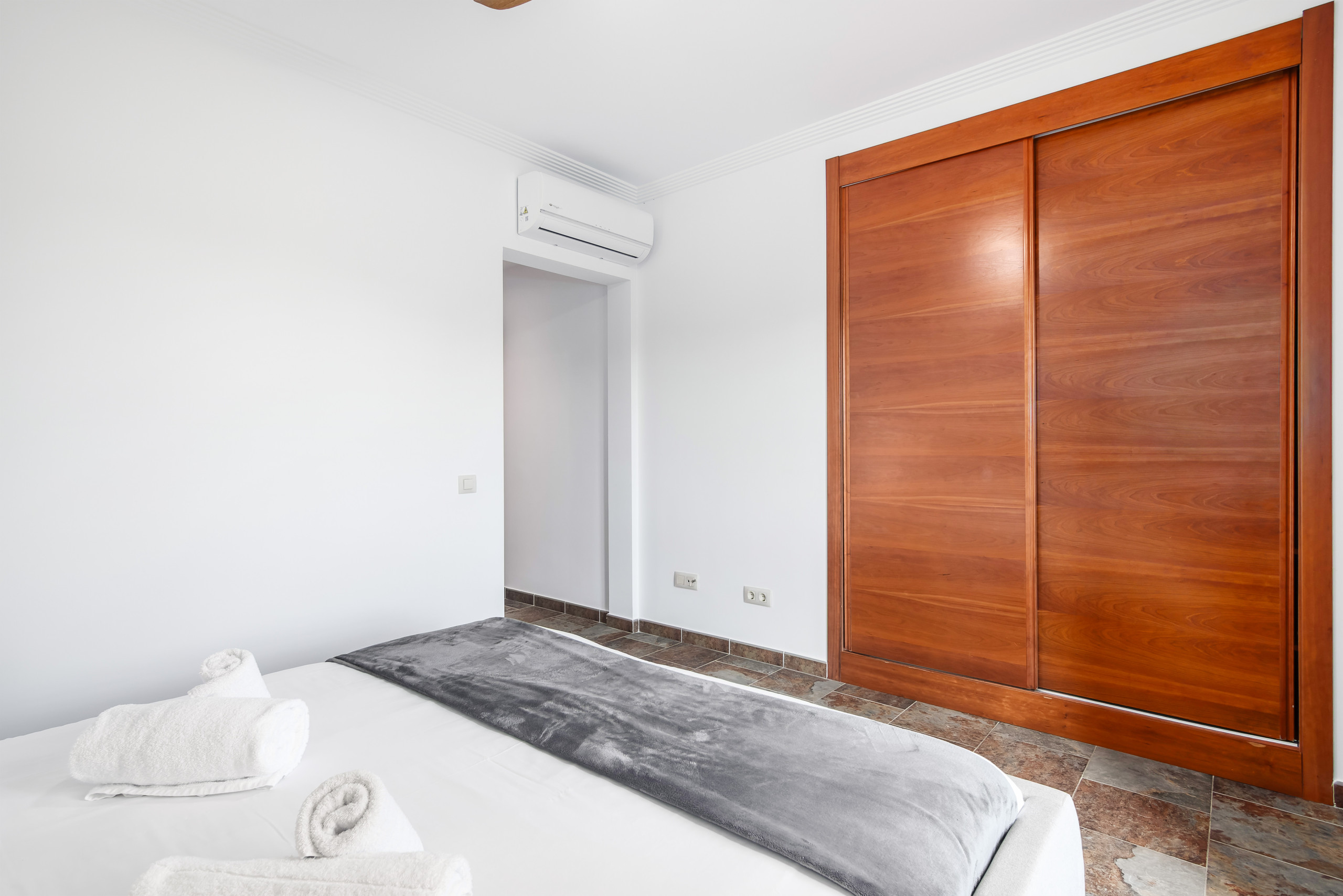 El apartamento cuenta con tres dormitorios que pueden alojar hasta 6 adultos, con una distribución versátil de camas: una cama doble, una king size, dos individuales y una cama supletoria. Todos los espacios están climatizados con aire acondicionado y calefacción de bomba de calor para garantizar tu comodidad en cualquier época del año.