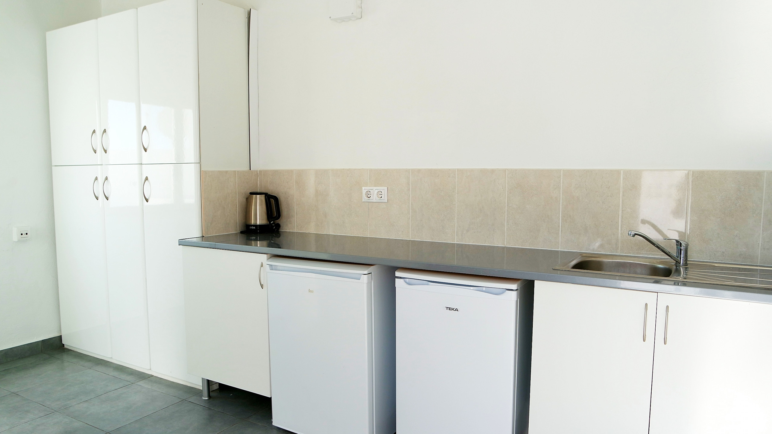 Det køkken med keramiske kogeplader, med service og køleskab, mikroovn, ovn, fryser, opvaskemaskine, tallerkener/bestik, køkkenredskaber, kaffemaskine, brødrister, kedel og saftpresser.