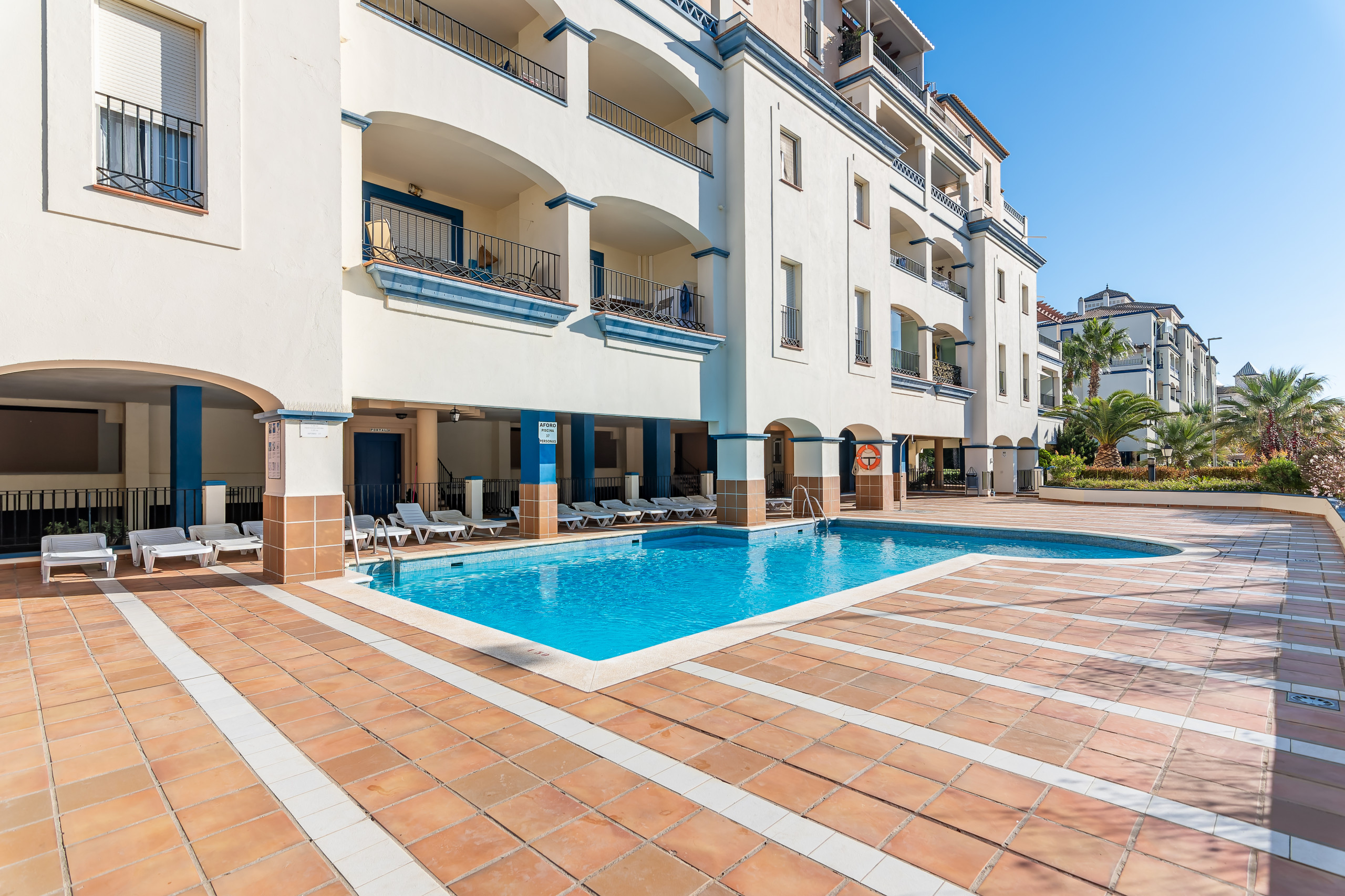 Tilbyder elevator, terrassemøbler, indhegnet grund, terrasse 5 m², vaskemaskine, tørretumbler, strygejern, internet (wifi), hårtørrer, varmepumpe, aircondition i hele ferielejligheden, swimming pool fælles, overdækket parkering til den samme bygning, 1 TV.