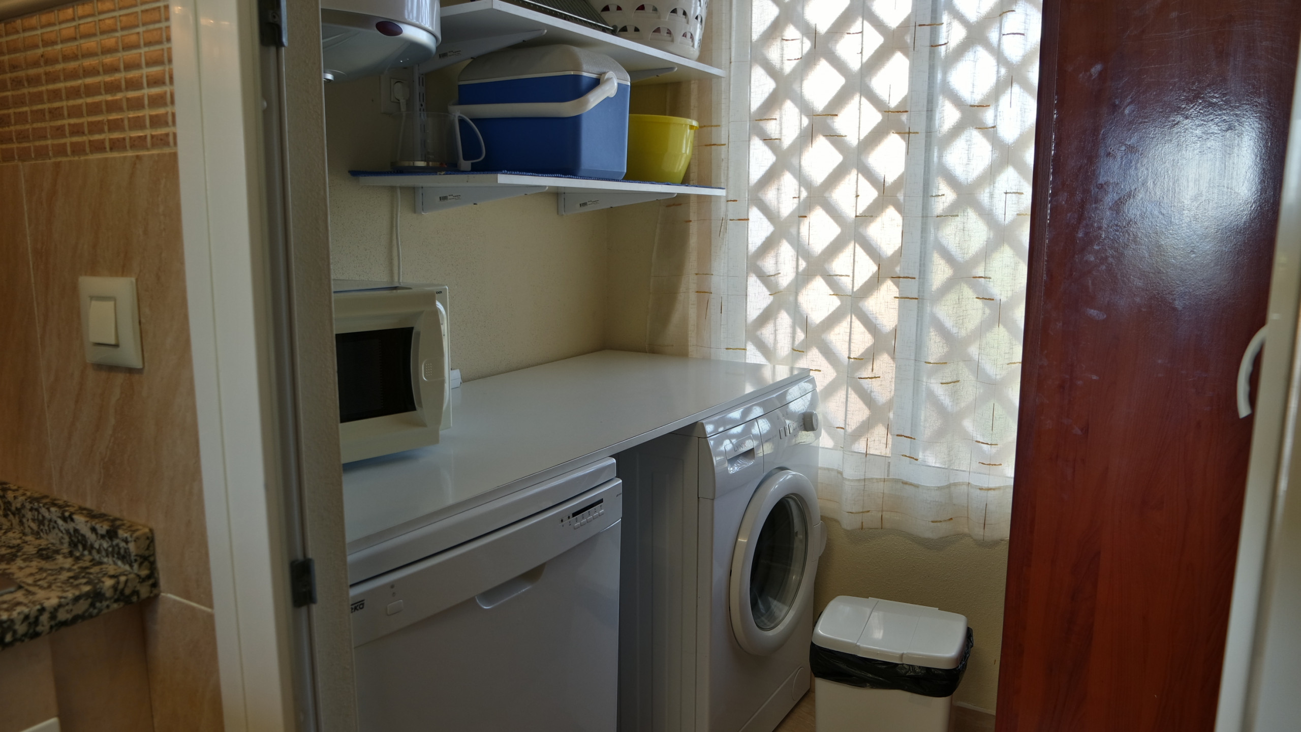 Die unabhängige elektrische Küche ist mit Mikrowelle, Backofen, Gefrierschrank, Waschmaschine, Geschirrspüler, Geschirr/Besteck, Küchenutensilien, Kaffeemaschine und Toaster ausgestattet.