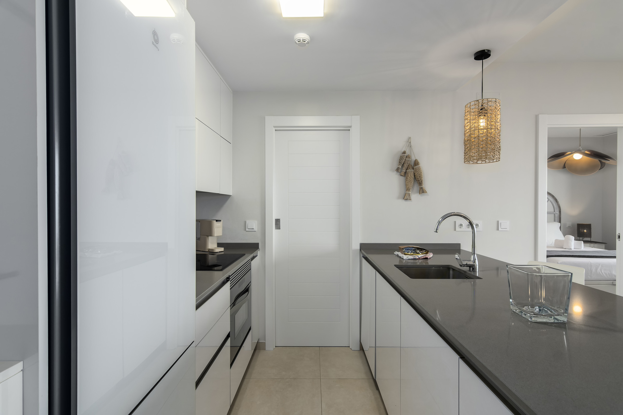 Die Wohnung verfügt über zwei Schlafzimmer, die bis zu 4 Personen bequem beherbergen können, mit einer Aufteilung von einem Doppelbett und zwei Einzelbetten. Es gibt zwei vollständige Badezimmer mit Dusche, was das Zusammenleben während des Urlaubs erleichtert. Die offene Küche ist komplett ausgestattet mit modernen Haushaltsgeräten wie Waschmaschine, Geschirrspüler, Ofen, Mikrowelle und Kaffeemaschine, die es ermöglichen, köstliche Mahlzeiten zuzubereiten.