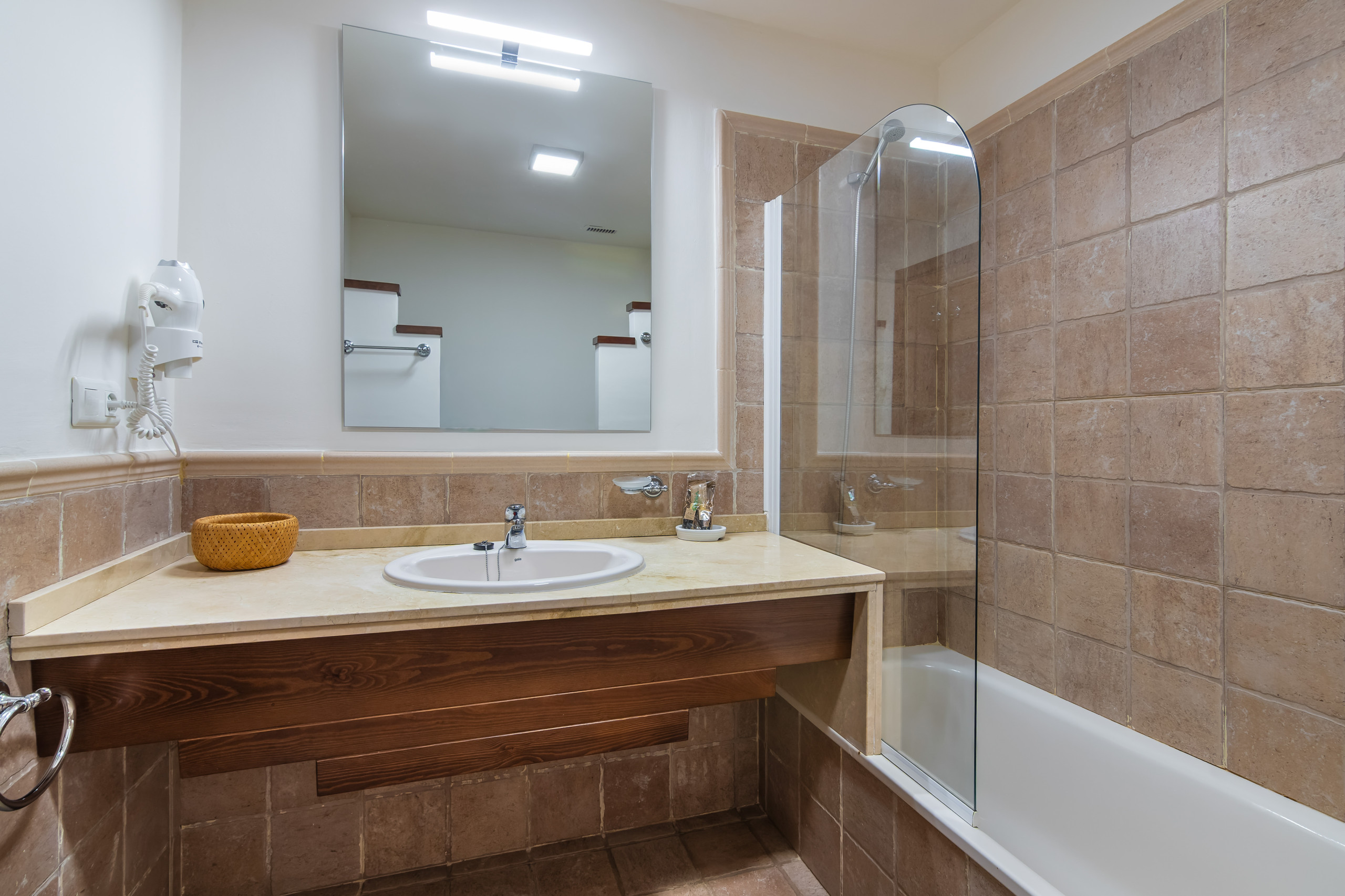 Het beschikt over twee ruime buitenslaapkamers. De hoofdslaapkamer, met uitgang naar het terras, heeft een tweepersoonsbed en beschikt over een ruime badkamer en-suite. De tweede slaapkamer met twee bedden heeft ook een uitgang naar een klein terras van waaruit men de woonwijk en het zwembad kan bereiken. Het appartement beschikt over een tweede volledige badkamer met dezelfde ruimte als de hoofdbadkamer.