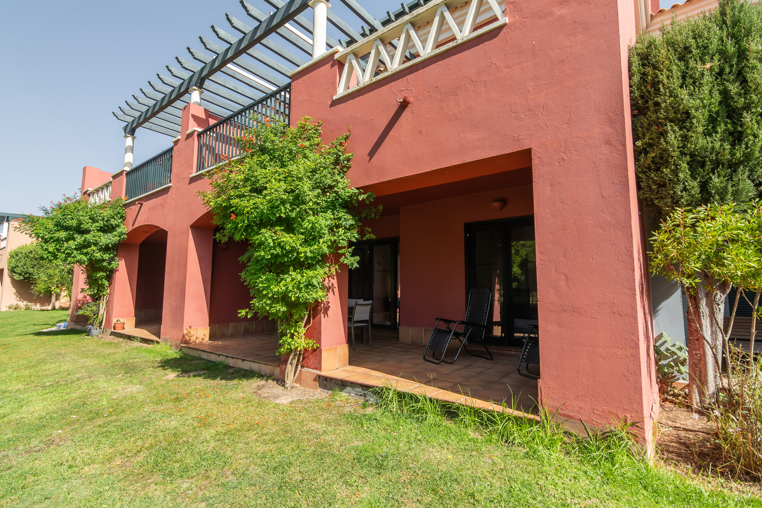 Volledig uitgerust en met zorgvuldige inrichting, bevindt het appartement zich op de begane grond met zeer gemakkelijke toegang vanuit de parkeerplaats. Het heeft een ruim gemeubileerd terras-veranda met uitzicht op hole 8 van de golfbaan (gescheiden door slechts een 1 meter hoge haag).