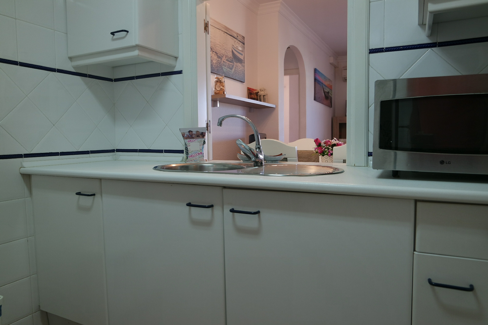 La finca en general, piscina, salida a la playa, parking y ascensores. El apartamento está bien decorado en su interior y en buen estado. Balleta, estropajo y trapos en la cocina. |