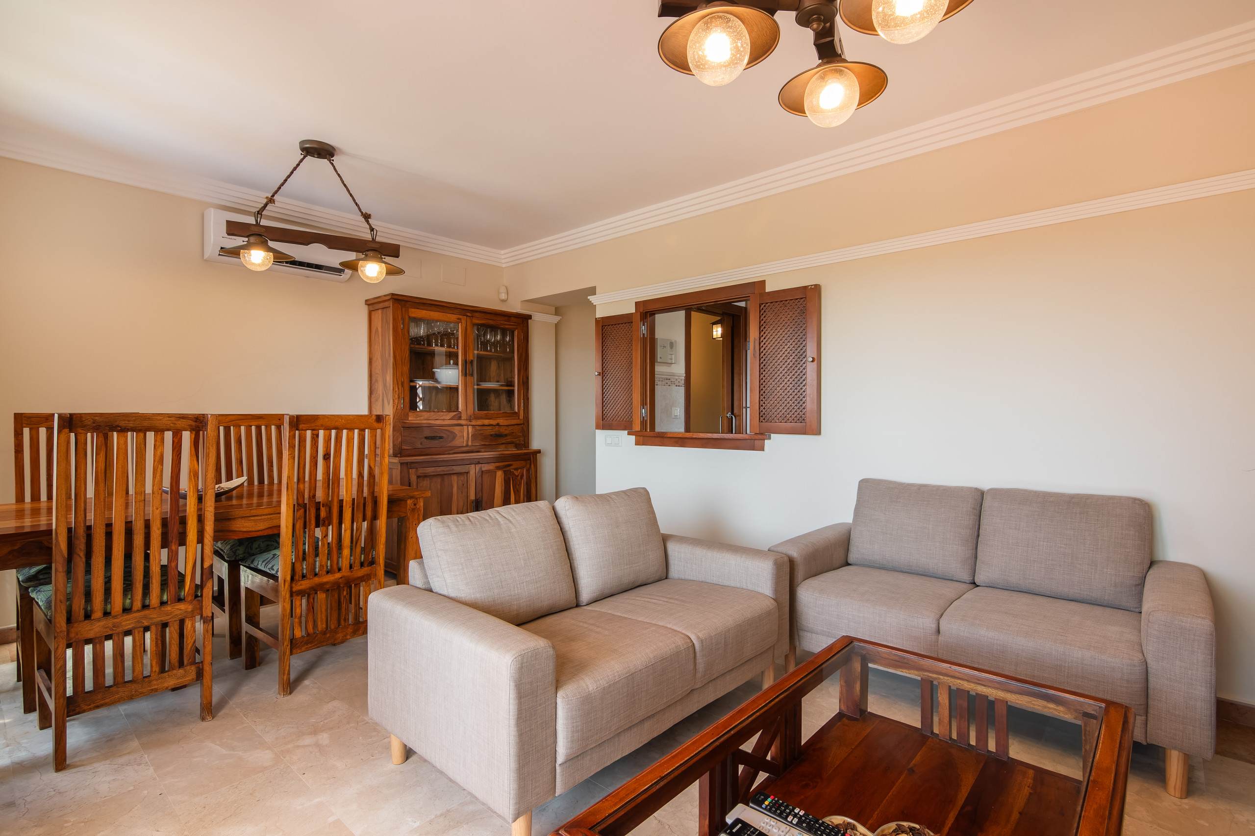 Vistas bonitas, proximidad a la playa, amplia terraza, camas muy cómodas, complejo de apartamentos grande y cuidado con canchas de padel y piscina.