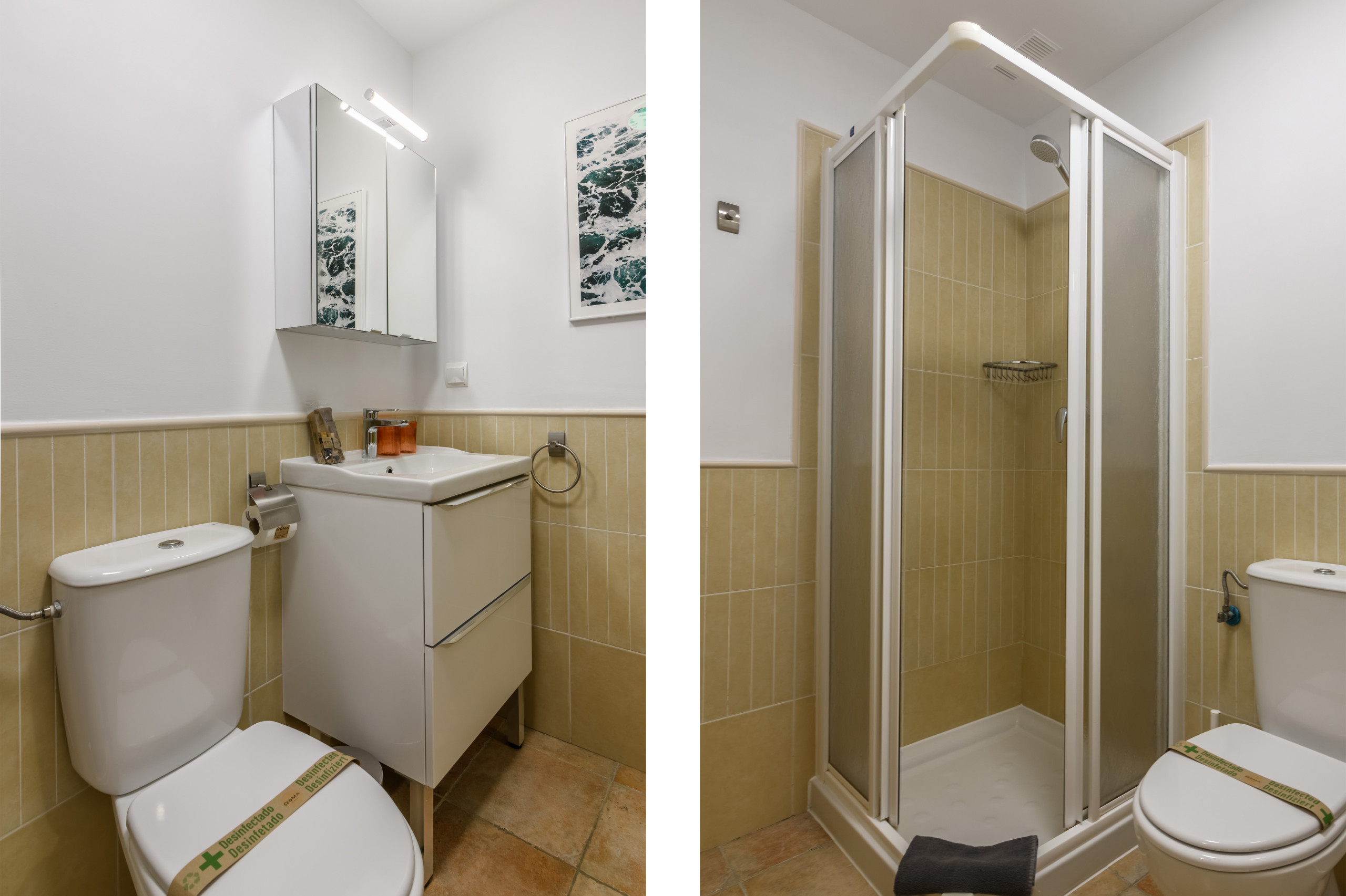 In the induction open plan kitchen, refrigerator, microwave, oven, freezer, dishwasher, dishes/cutlery, kitchen utensils, coffee machine, toaster and kettle are provided.