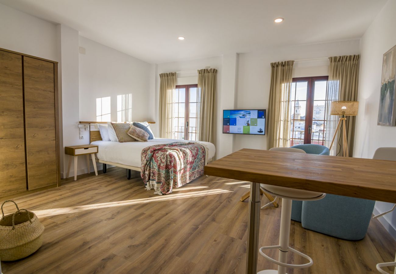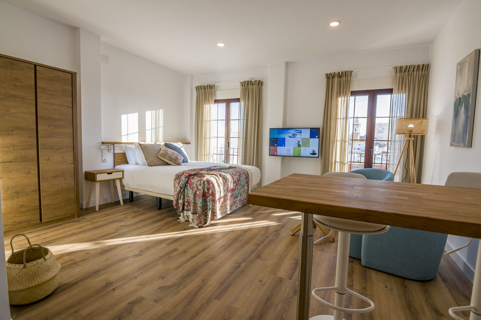 Our Superior Deluxe Studio, with 35 m², is the perfect choice for those looking for a superior level of comfort, luxury and spaciousness. This spacious studio has been designed to offer an exceptional experience, combining historical elements with modern details to provide an exclusive atmosphere in the heart of Ayamonte. The Superior Deluxe Studio has a queen size double bed and a sofa bed, making it an ideal choice for families or small groups who want extra space without compromising on comfort. The living area is cosy and well laid out, while the fully equipped kitchenette provides the option to prepare your own meals.the décor retains the original architectural style of the convent, with exposed wooden beams and high quality finishes, creating a sophisticated and warm ambience.the private bathroom is equipped with a rain shower and luxury amenities, ensuring a total relaxation experience. Some units offer panoramic views of the historic centre of Ayamonte, adding a special touch to your stay.Ideal for families, small groups or travellers seeking the highest level of comfort, the Superior Deluxe Studio offers a luxurious retreat in a historic setting full of charm and sophistication.35 reviews