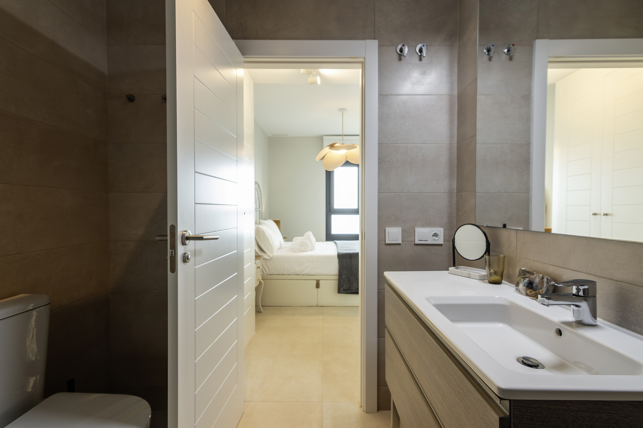 O apartamento conta com dois quartos que podem alojar até 4 pessoas comodamente, com uma distribuição de uma cama de casal e duas individuais. Dispõe de duas casas de banho completas com chuveiro, o que facilita a convivência durante as férias. A cozinha americana está completamente equipada com eletrodomésticos modernos como máquina de lavar roupa, máquina de lavar louça, forno, micro-ondas e máquina de café, permitindo preparar refeições deliciosas.